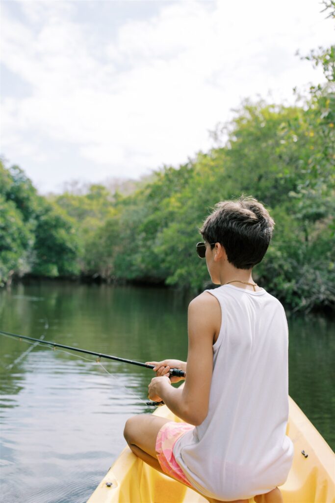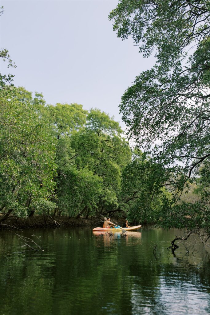 Another magical feature of the property is the estuary that winds through the reserve, where guests can kayak quietly through the water while spotting birds, monkeys, and other wildlife along the shoreline or have fun fishing. It adds another layer of exploration beyond the beach and jungle trails and makes the landscape feel even more diverse and alive.
